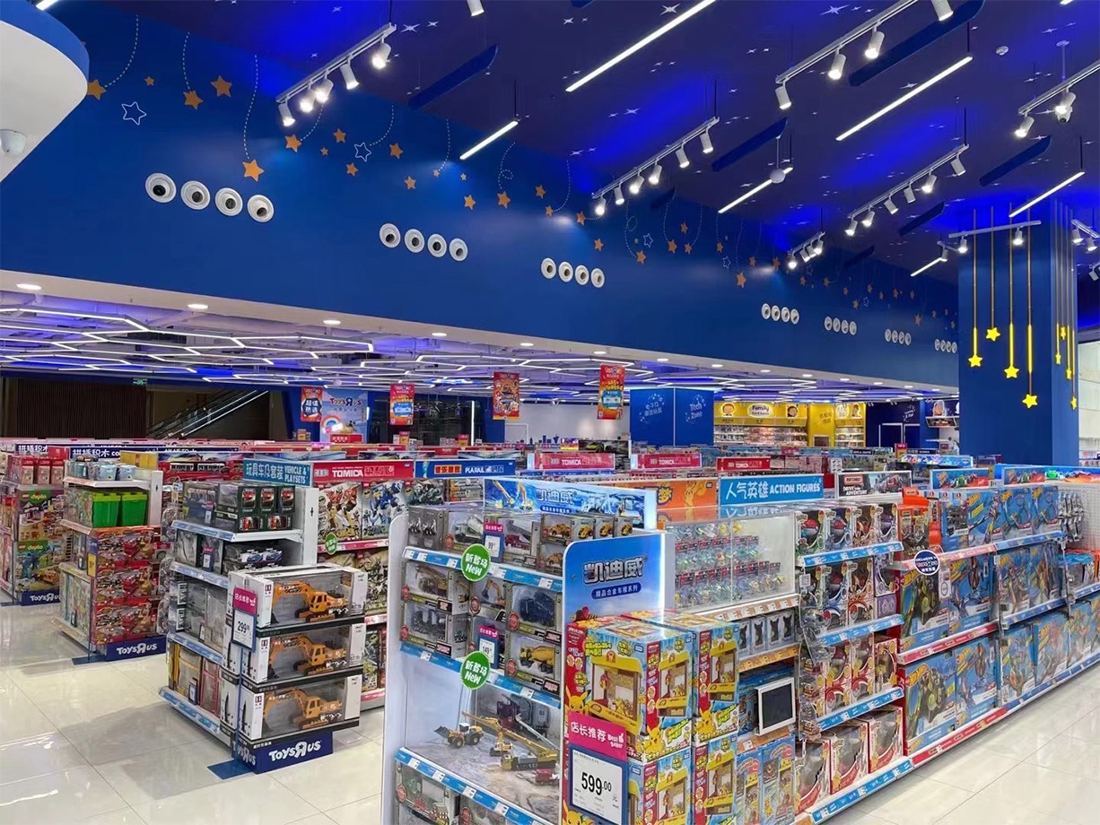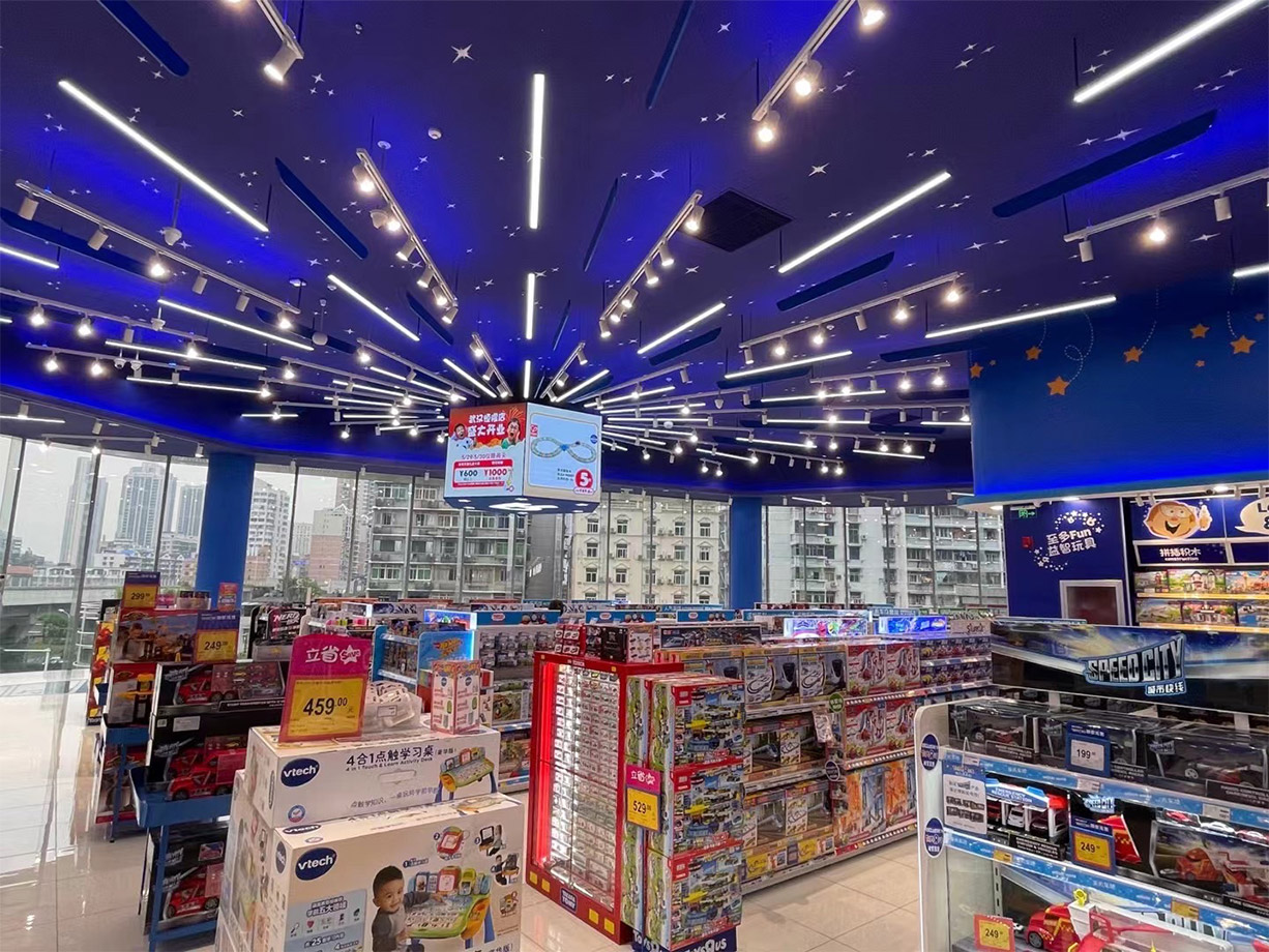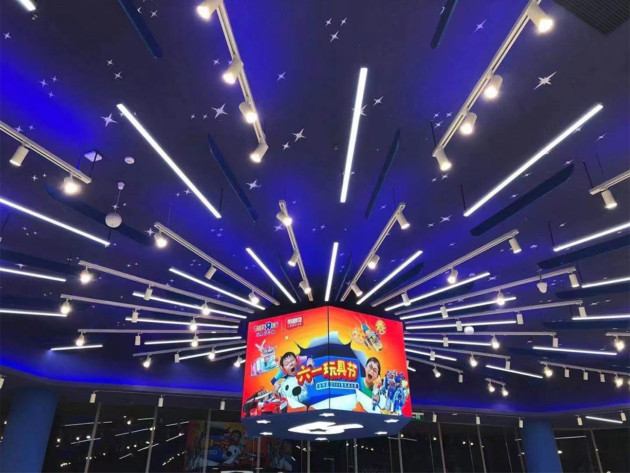 Toys”R”Us is the leading kids store for all toys, video games, dolls, action figures, learning games, building blocks and more. Toys”R”Us has more than 200 stores in China. This time, the store in Wuhan Heartland 66 is Toys”R”Us largest store in China, with an area of 900 square meters. There is a 6-meter ceiling in the middle of the store. According to the design requirements of the customer, damo union has created the entire ceiling into a dark blue starry sky scene. Brought great passenger flow and popularity to the shop.